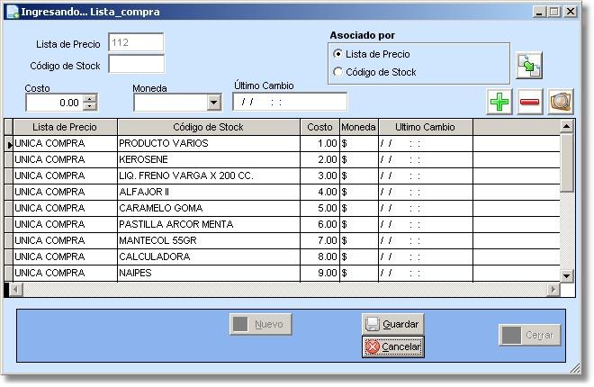 Para agregar el precio de un artículo dentro de una lista de precios de compra indique la lista de compra deseada sobre el campo Lista de Precio (o haga doble clic dentro de este campo para realizar la búsqueda), marque la opción Lista de Precio (en el grupo Asociado Por), presione Nuevo e indique el código del artículo sobre dicho campo Código de Stock (o haga doble clic dentro de este campo para realizar la búsqueda), indique el precio y la moneda, presione el botón Agregar a la lista (botón con el signo más). Para agregar el precio de un segundo artículo indique dicho código (o búsquelo) sobre el campo Código de Stock, indique el precio y la moneda, presione el botón Agregar a la lista (botón con el signo más).