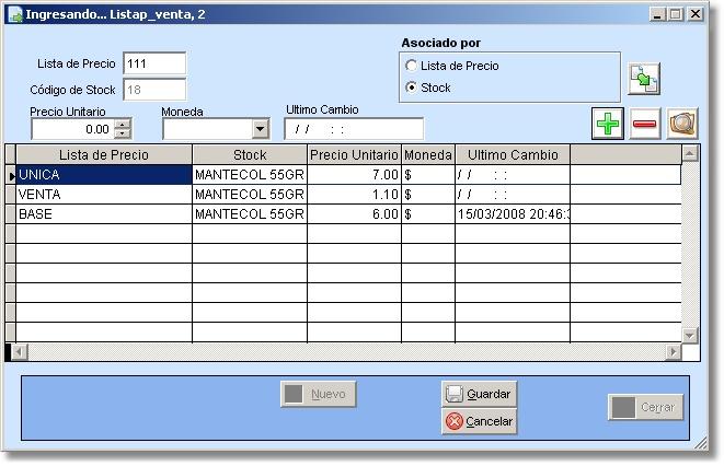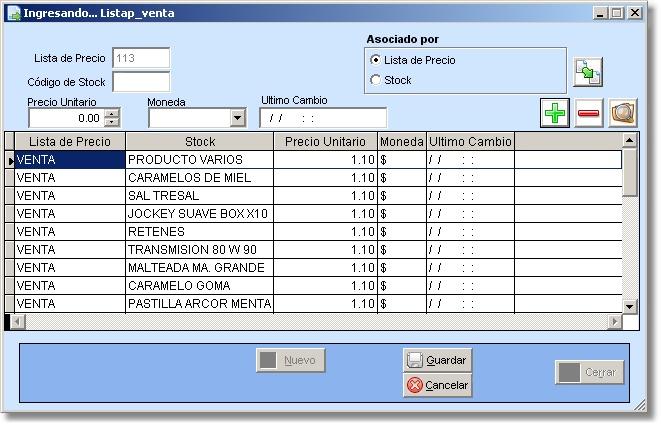 Los dos procedimientos detallados anteriormente (agregar y eliminar) pueden ser realizados de forma similar realizando la asociación por Código de Stock (marcando la opción Stock en el grupo Asociado por), indicando lógicamente dicho código sobre el campo Código de Stock previamente. Al presionar luego Ver asociación se mostrará el valor del artículo indicado en Código de Stock, en todas las Listas de Precios de las cuales forma parte (imagen siguiente).
