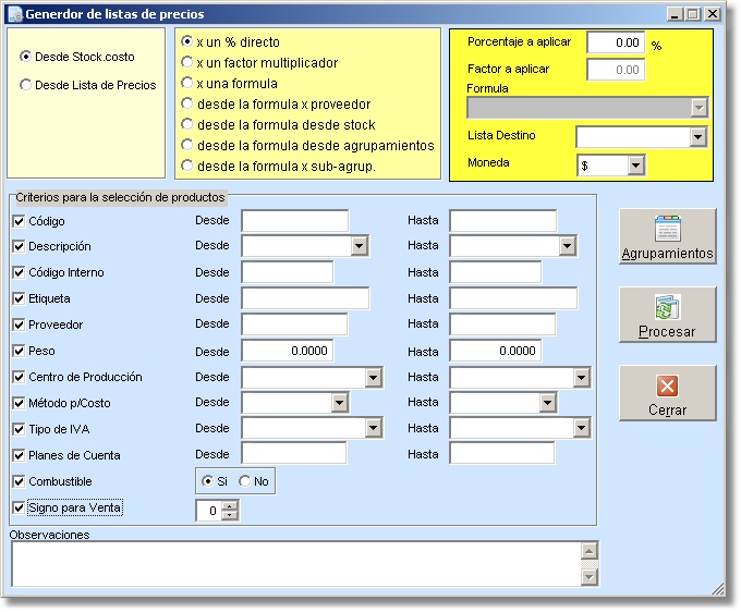 De esta lista se pueden tildar los distintos criterios para seleccionar los productos, que se incluirán en la nueva lista de precio. Por defecto al no tildar ningún criterio se incluyen todos los productos del stock. |