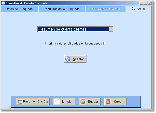 Desde aquí se podrá realizar consultas de cuenta corriente de Clientes y de Proveedores. A esta opción accede seleccionando del menú principal Consultas, la opción Consultas de Cuentas Corrientes.