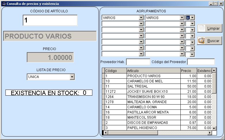Se puede tipear el código del artículo a buscar y el sistema mostrará el precio registrado para la lista de precio mostrada en la parte inferior.