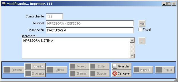Luego de haber indicado el nombre del archivo que se utilizará y la cantidad de copias, será necesario además indicar la impresora que utilizará ese comprobante (esto será necesario realizarlo en cada terminal –PC-, en caso de tener el sistema instalado en red). Ingresando en la opción Sistema->Impresoras se accederá a realizar esta configuración: