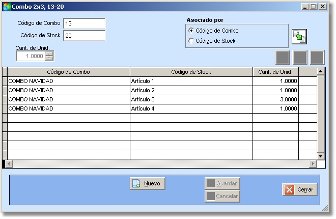 Es posible definir o configurar en el sistema los distintos combos o recetas que sean necesarios, a fin de poder llevar también un control de stock de determinados artículos o insumos que conforman productos terminados que se comercializan.