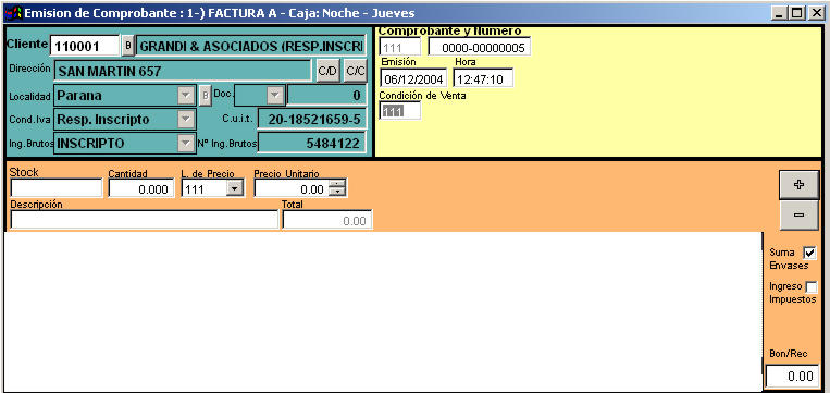 | Bon/Rec | Permite asignar un porcentaje para bonificar o recargar al total del comprobante, este porcentaje tiene asociado un signo, que es el que determina si es una bonificación (signo negativo), o un recargo (sin signo). |