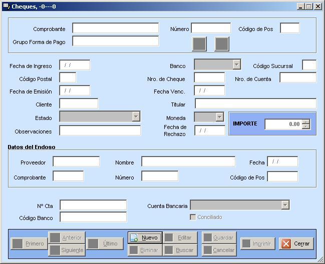 En la parte superior del formulario se encuentran cuatro campos para asociar los cheques con comprobantes cargados en el sistema. En caso de no asociar los cheques a ningún comprobante, la asociación se realizará con el comprobante predeterminado en la configuración del sistema. Ver Configuración del sistema.