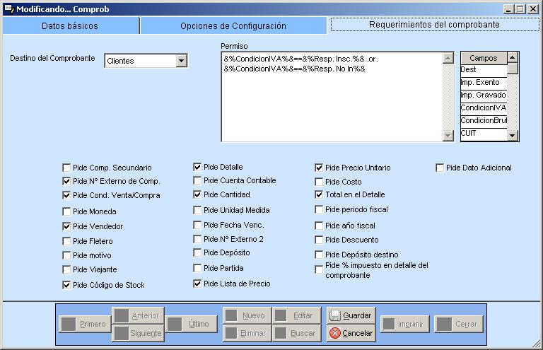 Además de esta configuración se podrán definir los permisos para la emisión del comprobante ingresando en la lista Permisos el código SQL de las condiciones que deberá reunir el destino (cliente o proveedor), para poder emitirse el mismo. Las variables que pueden ser contempladas para definir las condiciones se encuentran a la derecha de esta lista, las cuales pueden ser seleccionadas con el mouse haciendo doble clic en la lista Campos para ser ubicada en la posición del cursor en la lista Permisos.