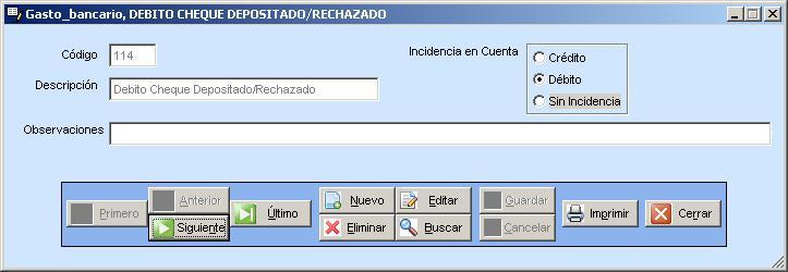 Permite definir los diferentes tipos de gastos bancarios para la administración de las Cuentas Bancarias. A esta opción se accede a través del menú principal Cajas y Bancos.