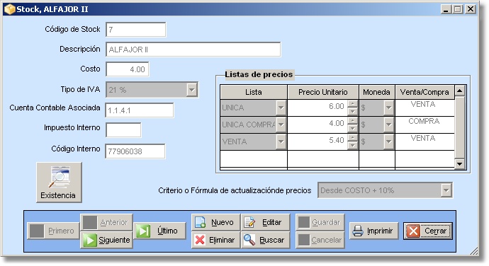 Mediante esta opción se permitirá administrar los productos de stock. Esta opción es similar a Stock, sólo que esta tiene los datos indispensables para poder facturar. Esta opción es de utilidad cuando el negocio no necesita un detalle minucioso de los artículos de stock con los que cuenta.