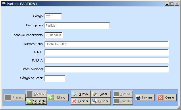 A esta opción se accede desde el menú principal Stock, y dentro de este seleccionando Partidas.