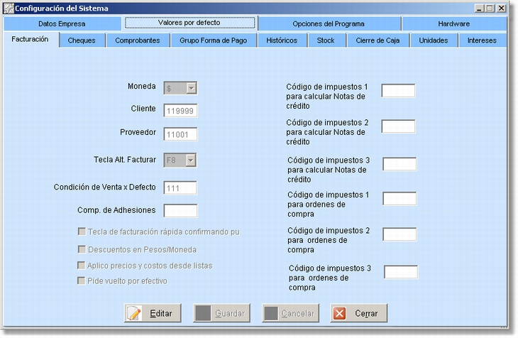 2)Configuro el Punto de Venta por defecto (Sistema->Configuración del Sistema, en solapa «Datos» y dentro de ésta en «Puesto de Venta» se define en el campo "Código de POS" el que se utilizará en esa terminal, haciendo doble clic aparecen las opciones. Si no aparece el P.V. que se necesita se lo debe dar de alta desde Mantenimiento->Condiciones para la emisión de comprobantes->Puntos de Venta1).