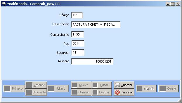 2Cuando se da de alta un nuevo Talonario (luego de presionar Nuevo), los campos se completan así: en "Código" se presiona F3, en "Descripción" se coloca el identificatorio, por ejemplo "FACTURA/TICKET -B- FISCAL"; en "Comprobante" se hace doble clic para elegir el código del mismo, en "POS" y en "Sucursal" se procede de igual manera, y en el campo "Número" debe colocarse los 12 dígitos correspondientes al próximo número a emitirse de ese comprobante (se lo saca del cierre Z, puede emitirse uno para saberlo.)