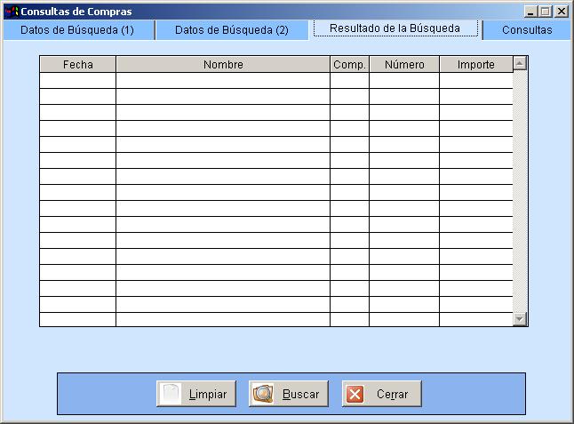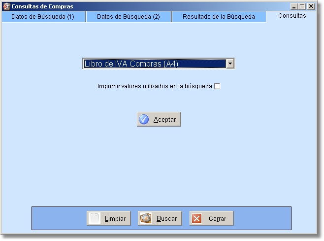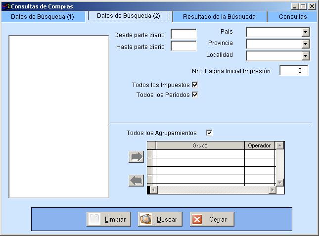 El mismo cuenta con distintas páginas o solapas, una solapa Datos de Búsqueda (eventualmente una segunda con criterios adicionales) en la cual se especifican los criterios que interesan filtrar (fechas, clientes, proveedores, comprobantes, etc.), una solapa Resultado de la Búsqueda que se muestra luego de presionar Buscar (previo a indicar los criterios de dicha búsqueda), y una solapa Consultas desde donde se elegirá la consulta que finalmente se ejecutará y que mostrará en un formato de salida de impresión la información buscada.