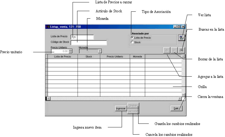 Cabe aclarar que los precios podrán ser ingresados de distinta forma según lo que se halla seleccionado en el cuadro Asociado por, ya que si escogió asociado por Lista de Precios se podrán ingresar o visualizar todos los productos a la lista de precios que se haya elegido, el que quedará como valor fijo y se irá variando sólo el Código de Stock. Si en cambio, se seleccionó asociado por Stock, se podrá ingresar asociaciones variando la Lista de Precios, teniendo como valor fijo el código de Stock.