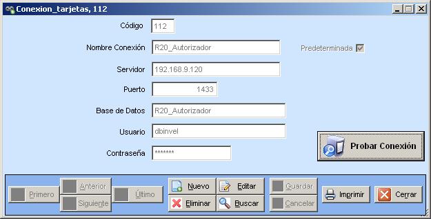 Permite la administración de las conexión con el servidor administrador de tarjetas (operaciones). Para acceder a esta opción, seleccione Mantenimiento del menú principal del sistema, luego la opción Tarjetas ON LINE y dentro de éste la opción Tarjetas - Conexiones.