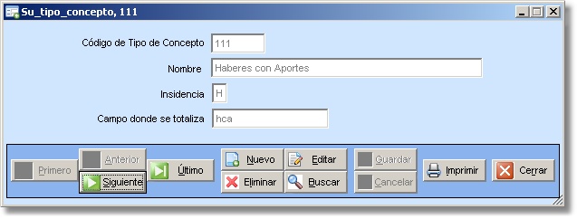 Esta opción permite realizar el mantenimiento de los Tipos de Conceptos que maneja el sistema. Para ello permite el ingreso de los siguientes datos: